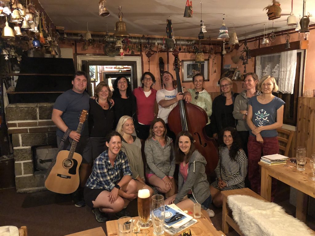 O víkendu jsem podnikla spolu se 14 ženami přechod Jizerskými horami. Jedním z noclehů byla Pešákovna, chalupa na Jizerce, kterou má na starosti pan vedoucí Lumír. Večer se nám zvrhnul do hudebního večírku, kdy Lumír hrál bravurně na basu, my tři ze 14 žen jsme si přehazovaly kytaru a se zbytkem zpívaly, ty, co nezpívaly, tančily..
